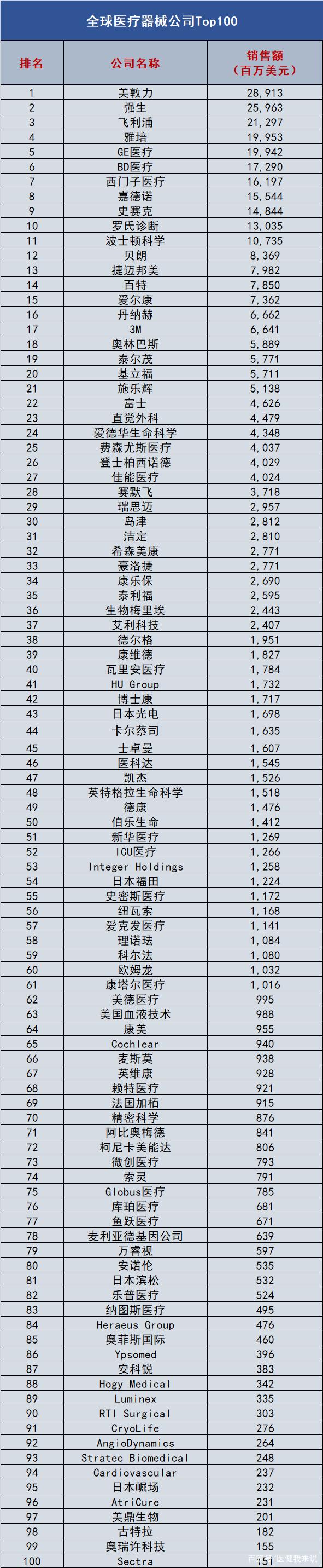 國外權威第三方網站QMED發布了《醫療器械企業百強榜單》,根據2020年銷售狀況對全球醫療器械公司進行了排名。